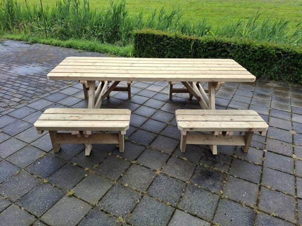 Een stevige en robuuste picknicktafel. Waar plek is voor maximaal 8 personen! Geschaafd en geschuurd hout zonder splinters/scherpe kanten! Helemaal geimpregneerd (waterbestendig).